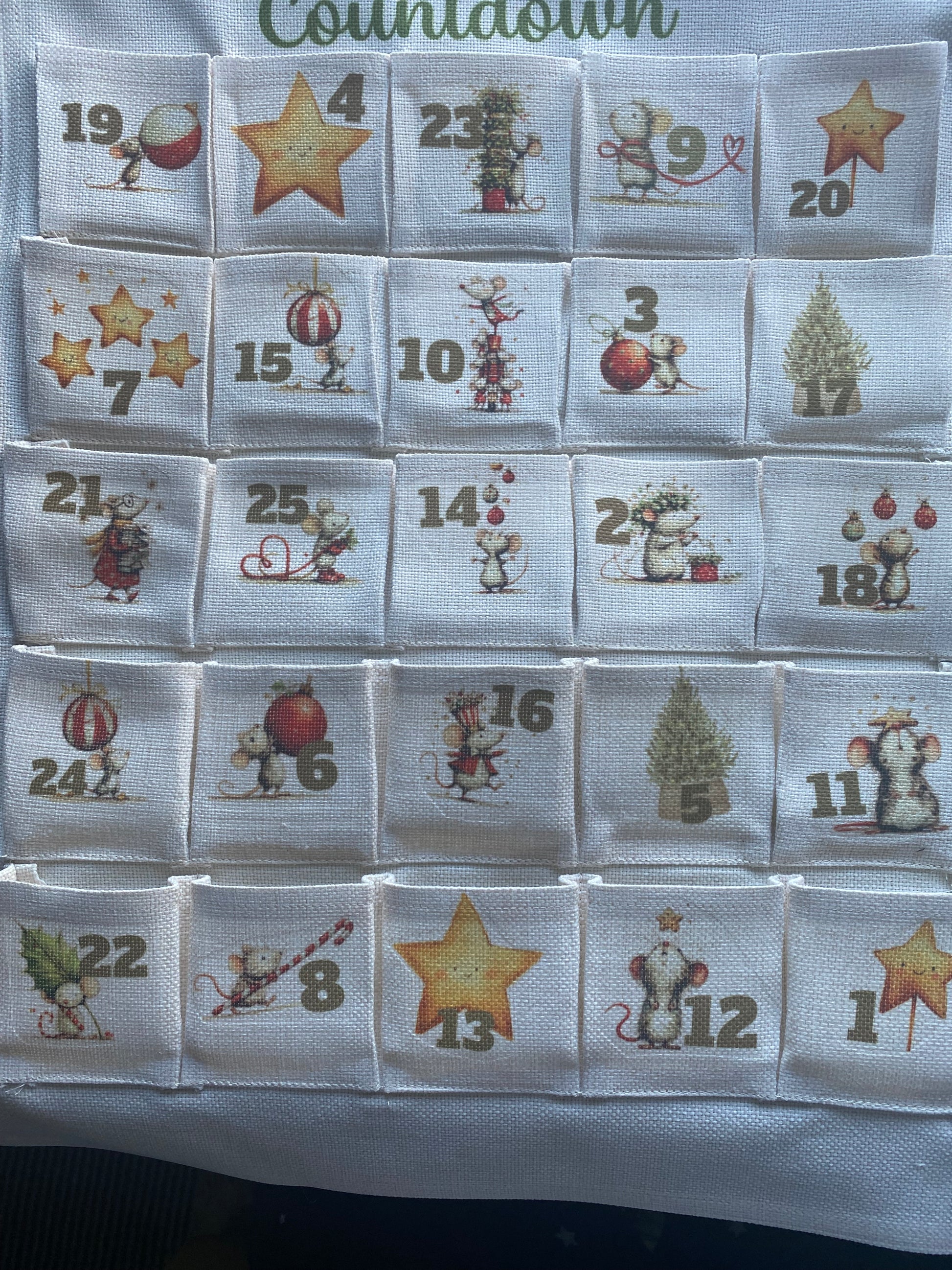 This hand printed fabric Christmas Mice advent calendar, comes with a set of six Christmas themed buddies. Santa Claus, Mrs Claus, Elf, Christmas tree, reindeer and gingerbread man. Ready to hang and can be personalised